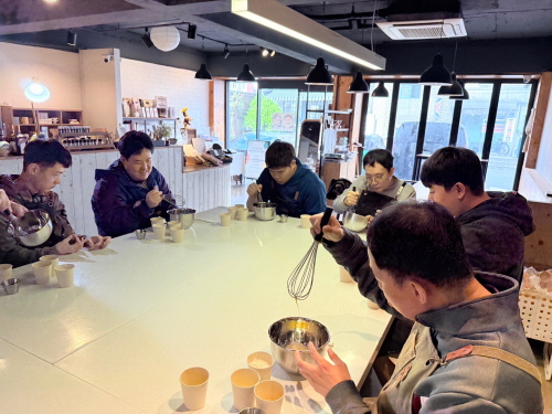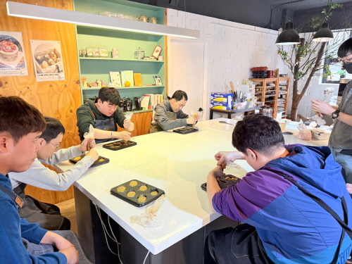 이용인들이 직접 계란, 설탕, 트림올린, 버터, 빵틀 등을 이용하여 강사와 소통하며